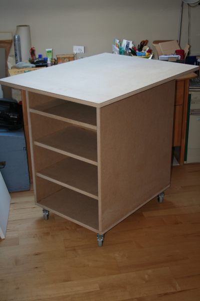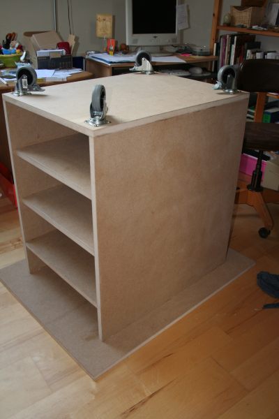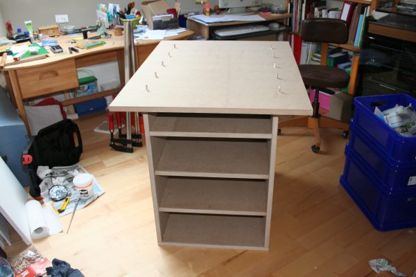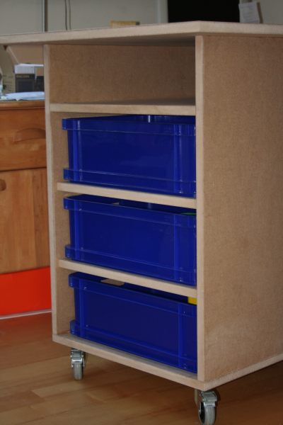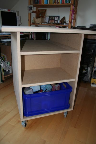 Es wurde eine Arbeitsplatte gebraucht und gleichzeitig sollte Stauraum entstehen. Mir fiel so eine Art Rolltisch ein.
