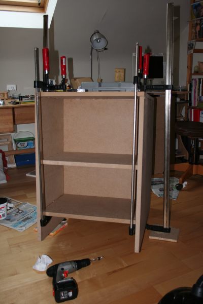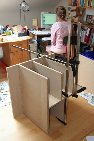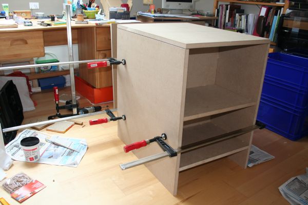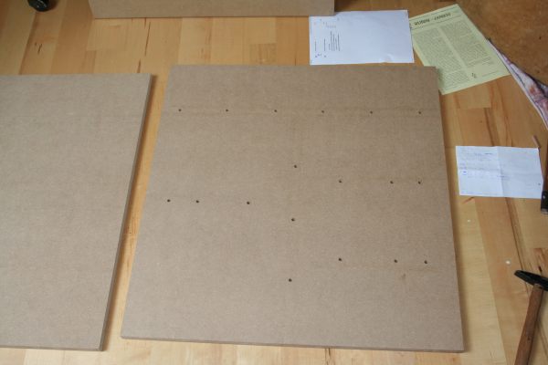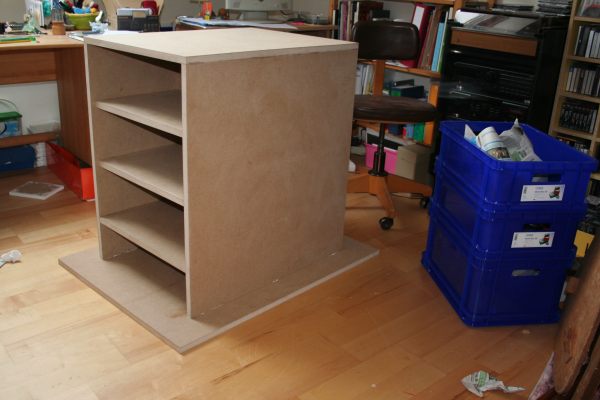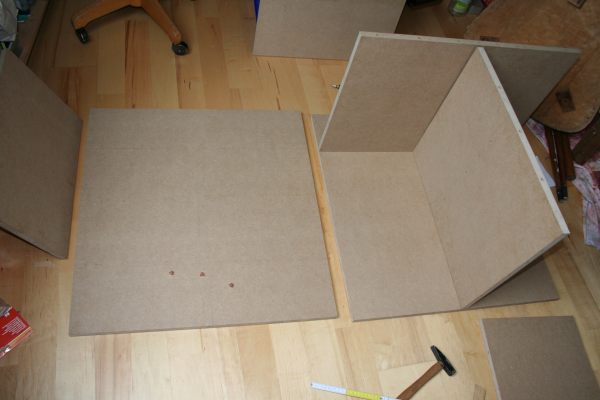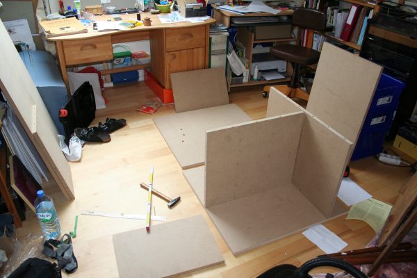 21 mm dicke MDF-Platten gabs zugeschnitten aus dem Baumarkt, womit das Säge-Problem eliminiert war. Als Werkzeug braucht ich nur